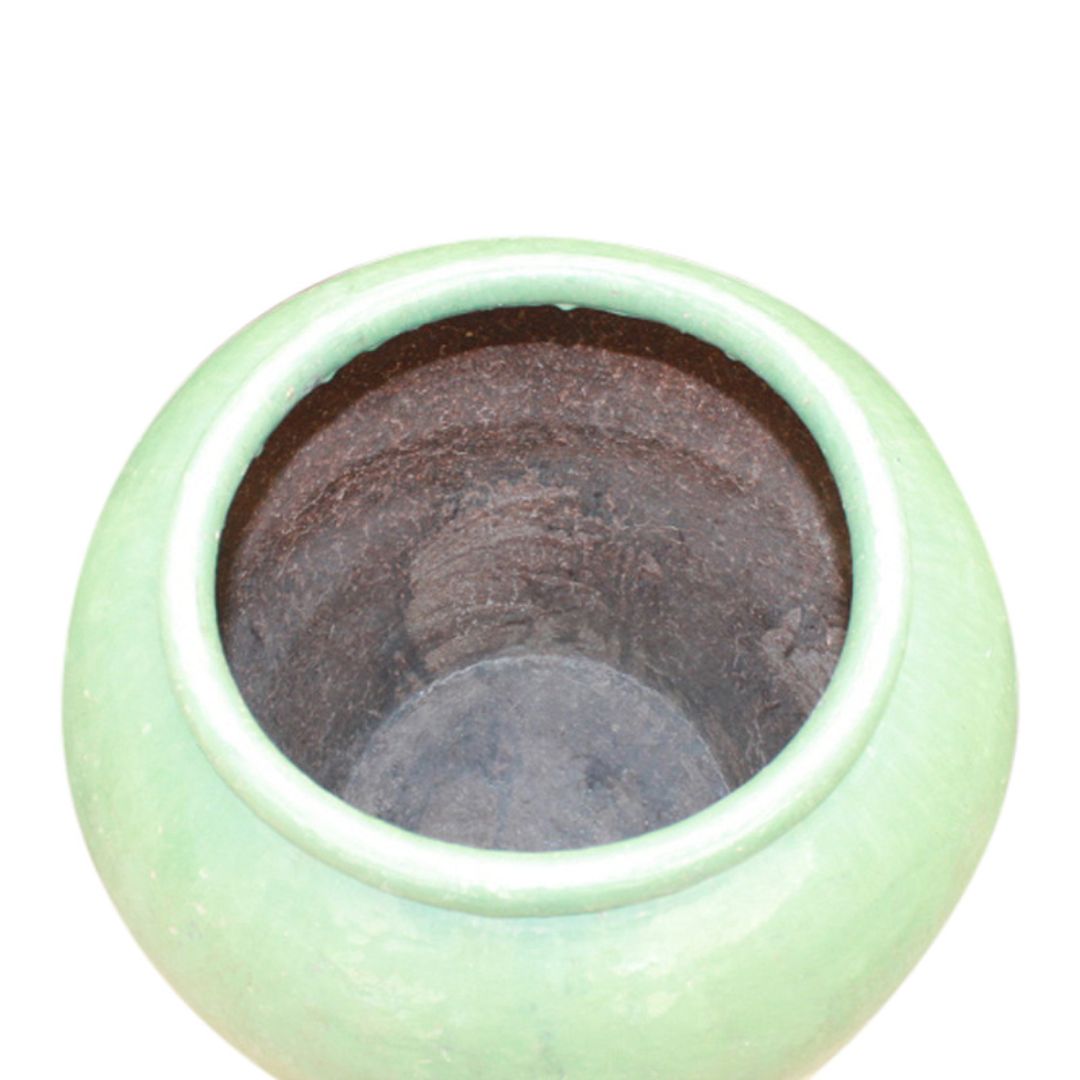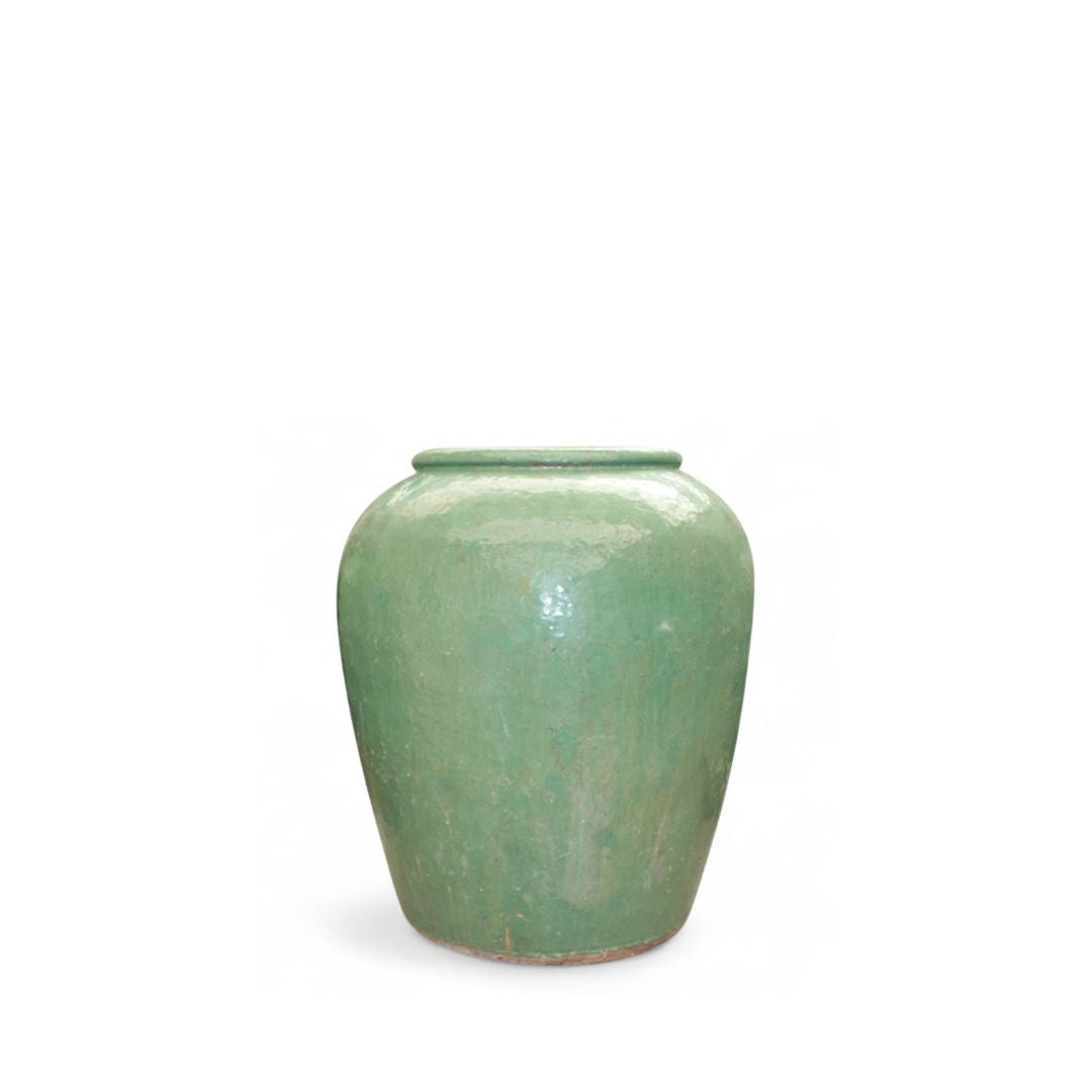 A large vintage ceramic jar from the Far East, finished in a deep emerald-green glaze. The softly rounded form and subtle surface irregularities reflect traditional ceramic craftsmanship and decades of age. Understated yet sculptural, the jar works equally well as a standalone object or as part of a composed interior setting.