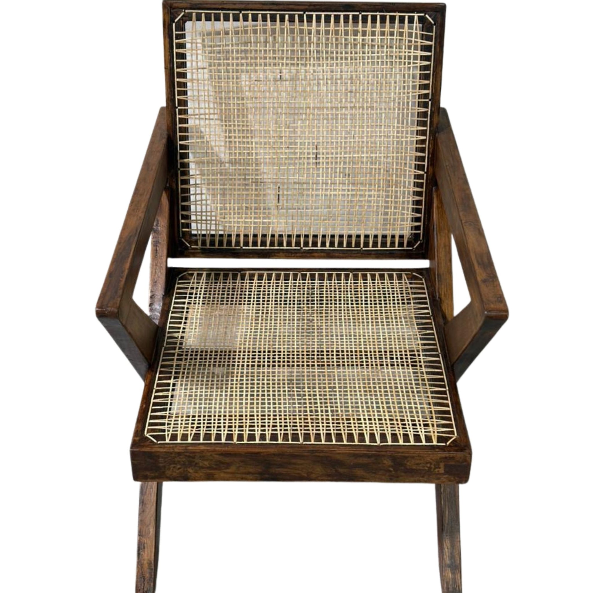 Also known as the Cross Easy Chair, this iconic Jeanneret design exemplifies the restrained modernism of the Chandigarh project. Crafted in solid teak with handwoven cane, the model is distinguished by its bold “X” double-leg frame, which flows into angular armrests and is joined by a central stretcher for both balance and integrity. The slanted, independent backrest in flat canework reflects Jeanneret’s sensitivity to proportion and comfort.
