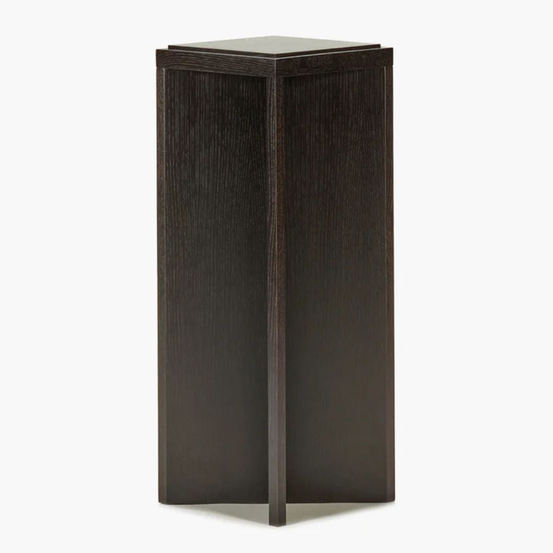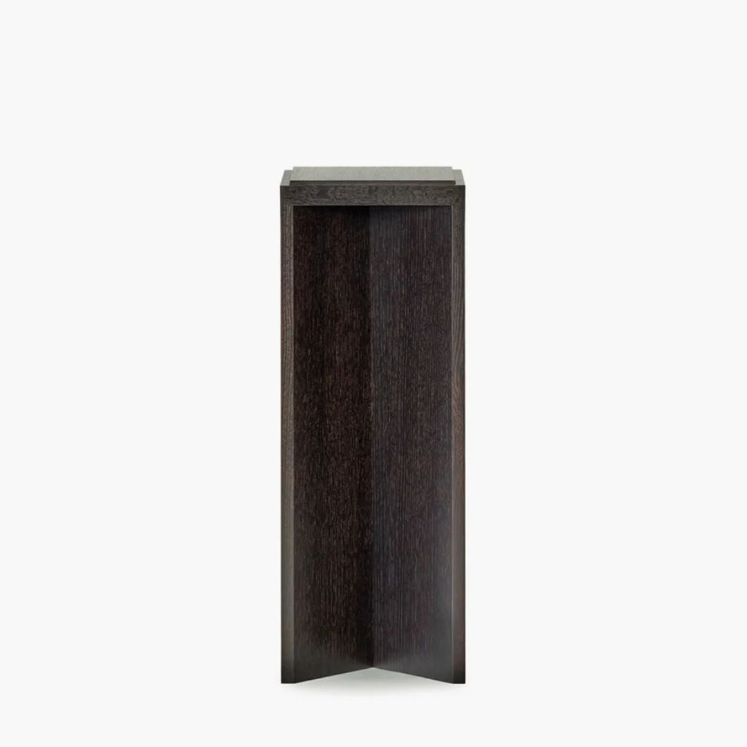 A sculptural Kubé 5 pedestal designed by Ann Demeulemeester, executed in solid dark brown oak.